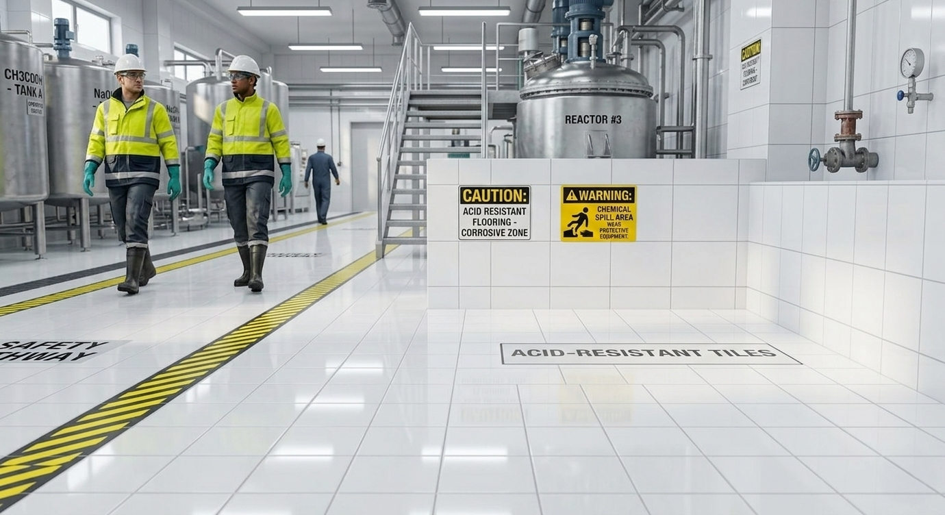Acid proof tiles are versatile and widely used across industries to protect infrastructure from corrosion, chemical spills, and mechanical stress. Key applications include: